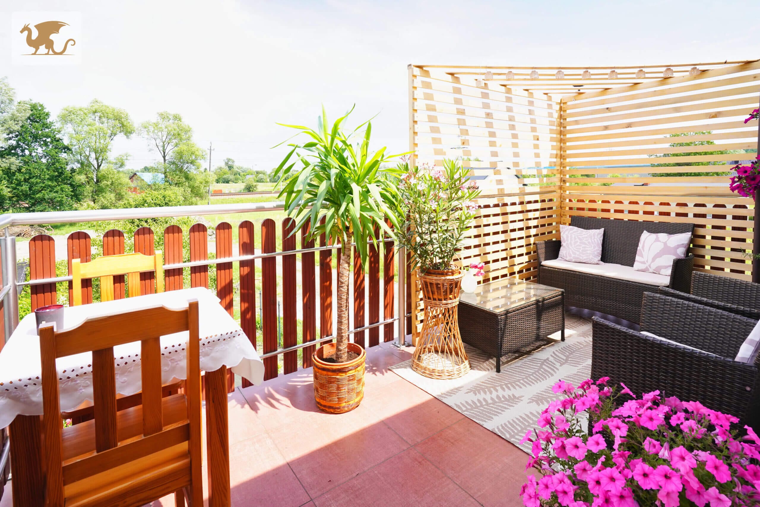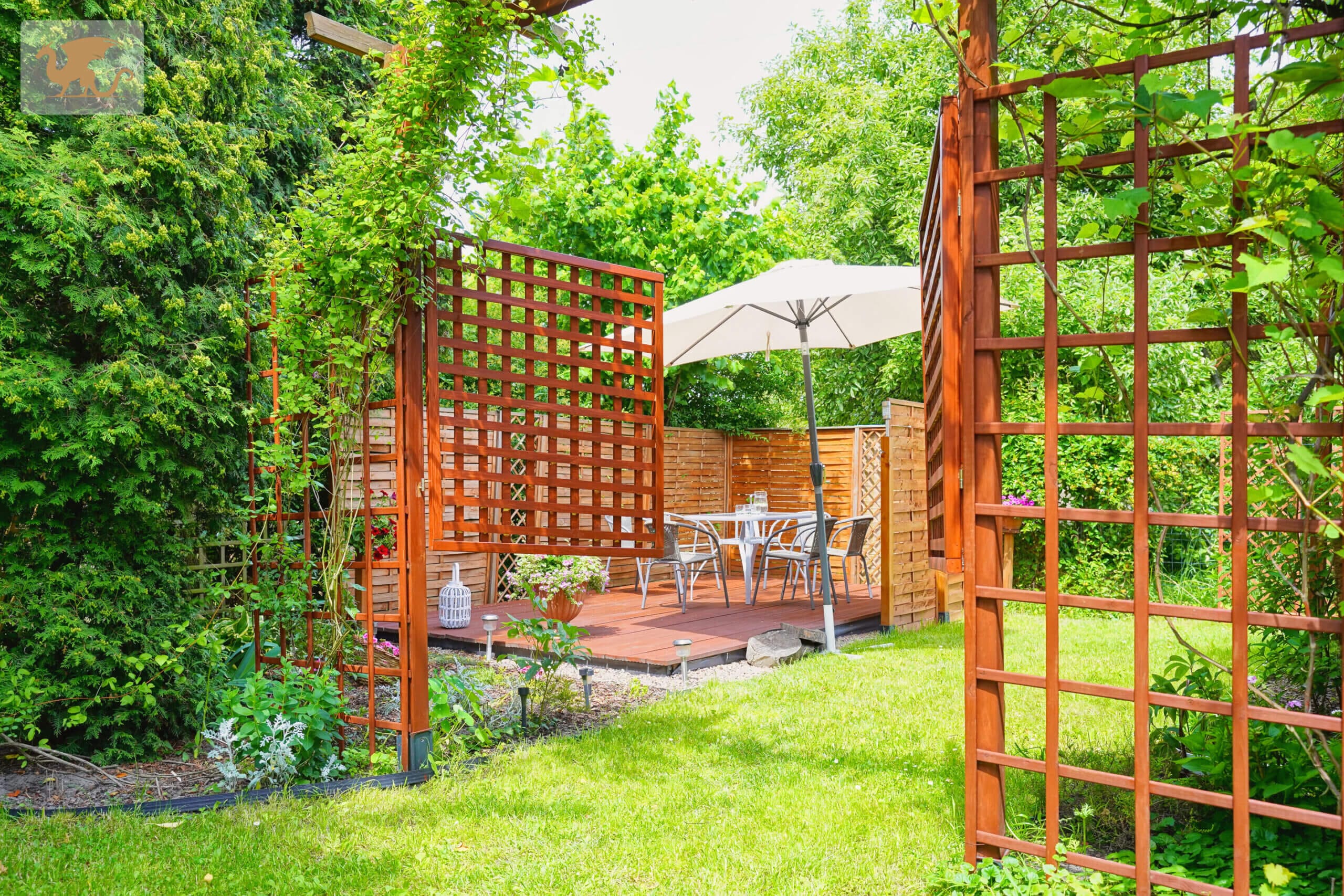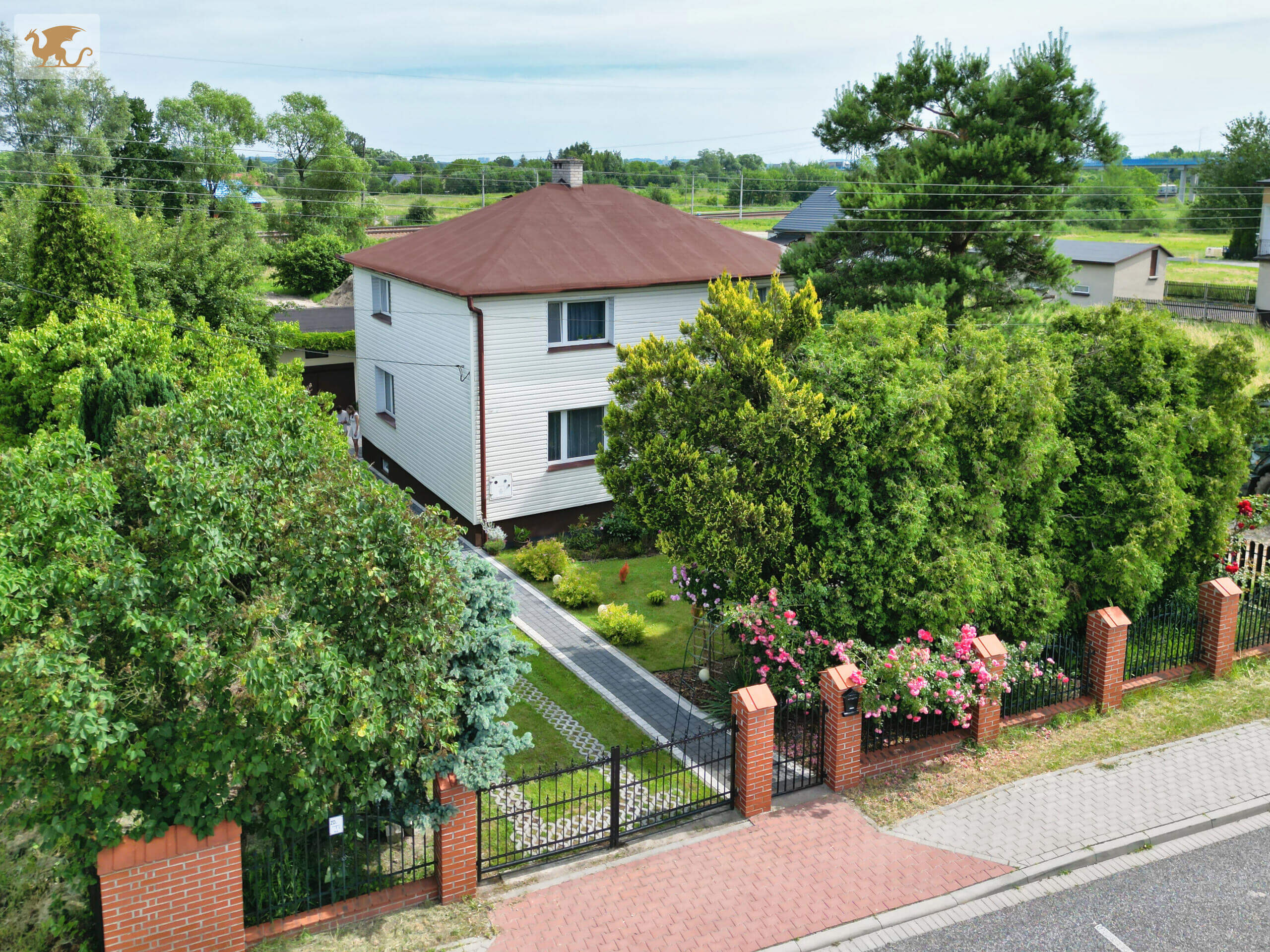 Działka 700 m2 jest znakomicie zagospodarowana: trawnik, nasadzenia ozdobne, drewniany taras z modrzewia – idealny do wypoczynku. Otoczenie sprzyja prywatności i spokojnemu trybowi życia.