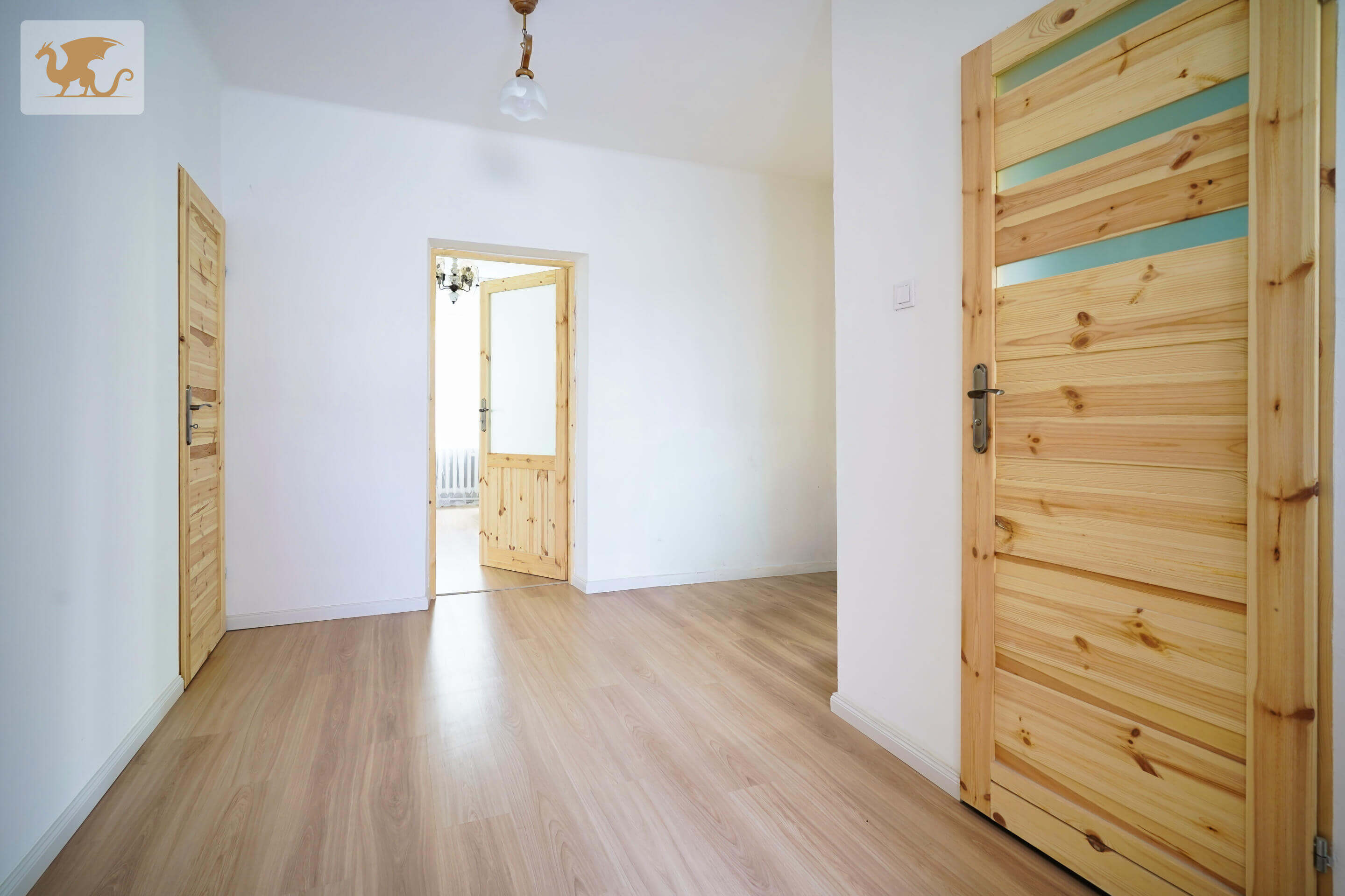 Wykończenie obejmuje m.in. deskę barlinecką, gres, ogrzewanie podłogowe w kuchni i łazience, solidne drzwi z drewna litego. Wysokość pomieszczeń: 2,6 m.