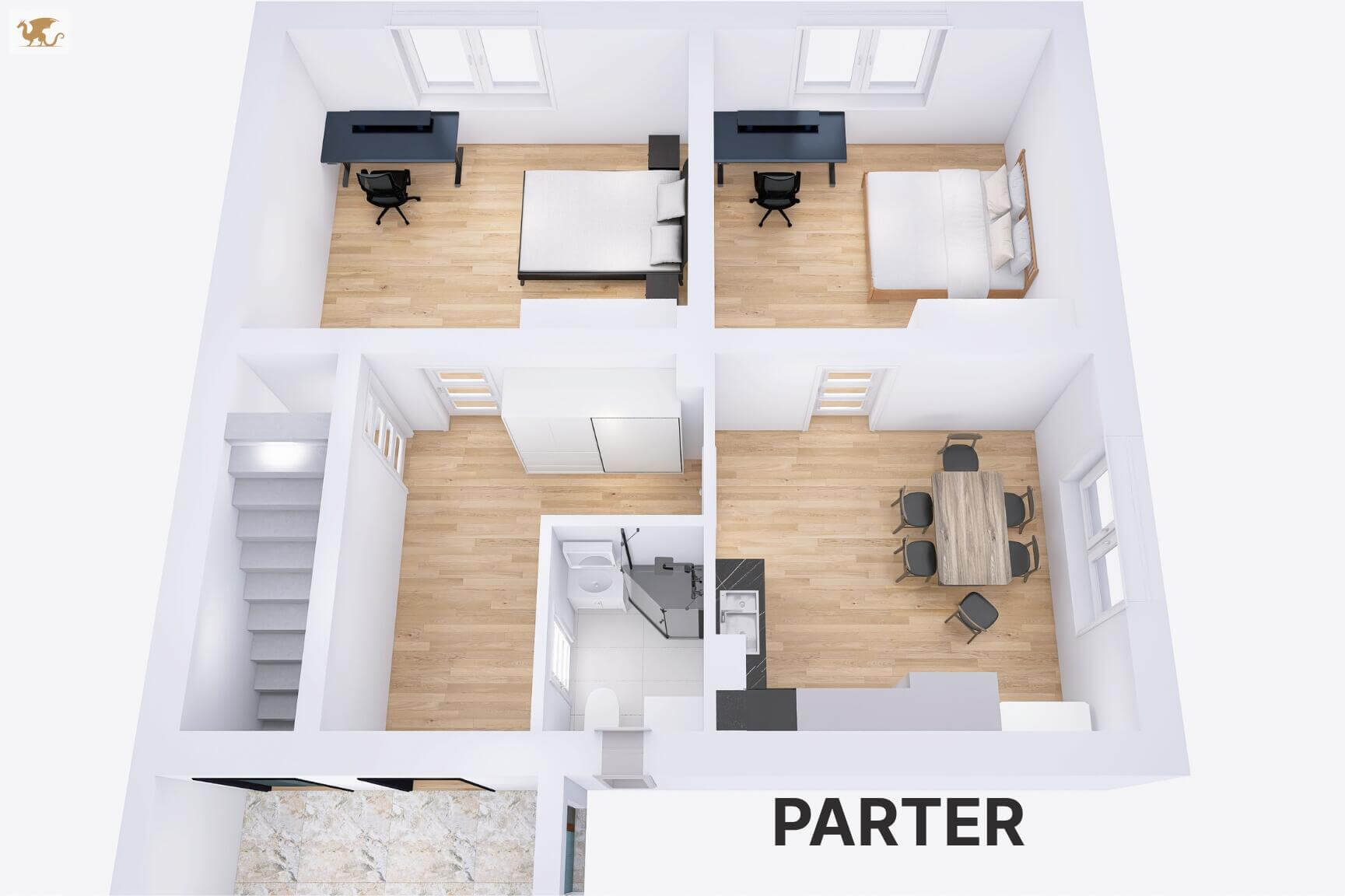 Układ parteru umożliwia jego wykorzystanie jako niezależnego lokalu mieszkalnego.