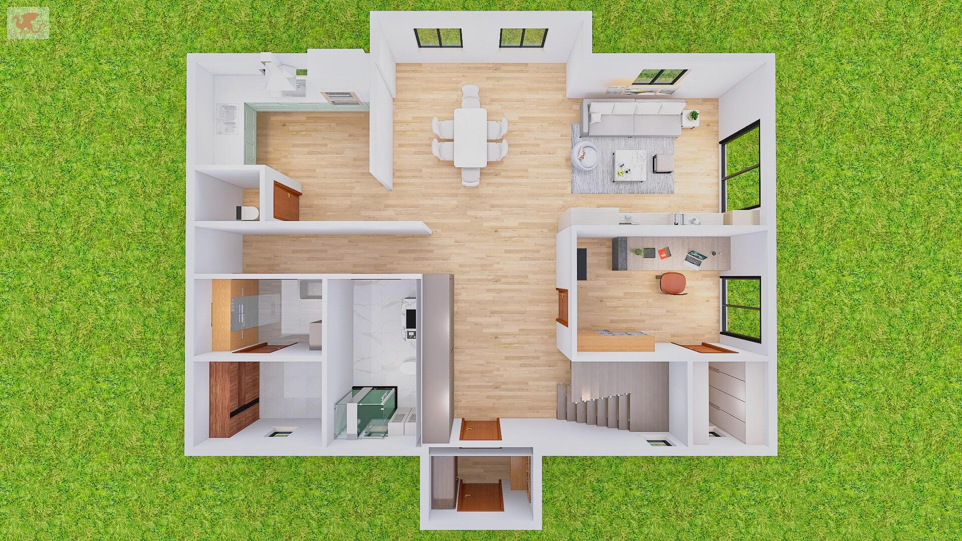 -Układ: salon z jadalnią, kuchnia, 5 pokoi, pralnia, spiżarnia, 2 łazienki, garderoby, pom. techniczne