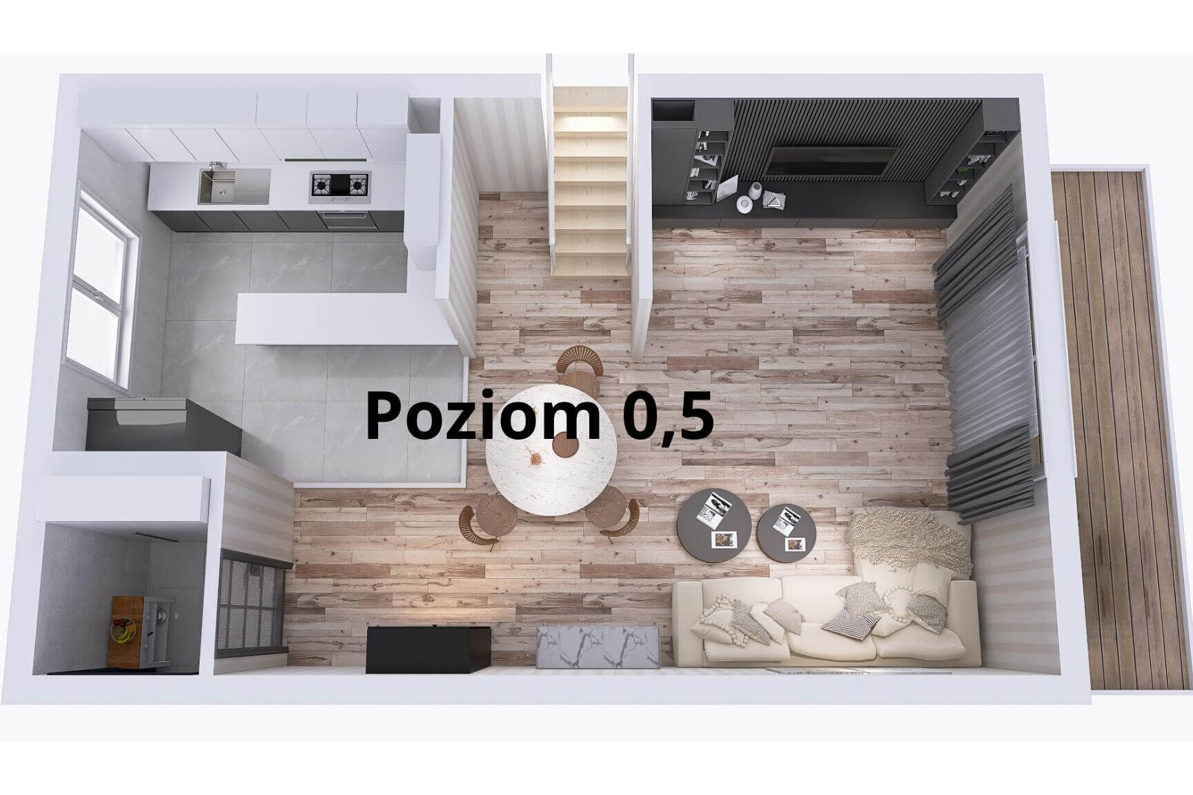 -Kolejne półpiętro: przestronna, otwarta strefa dzienna obejmująca kuchnię, jadalnię oraz salon z wyjściem na duży taras