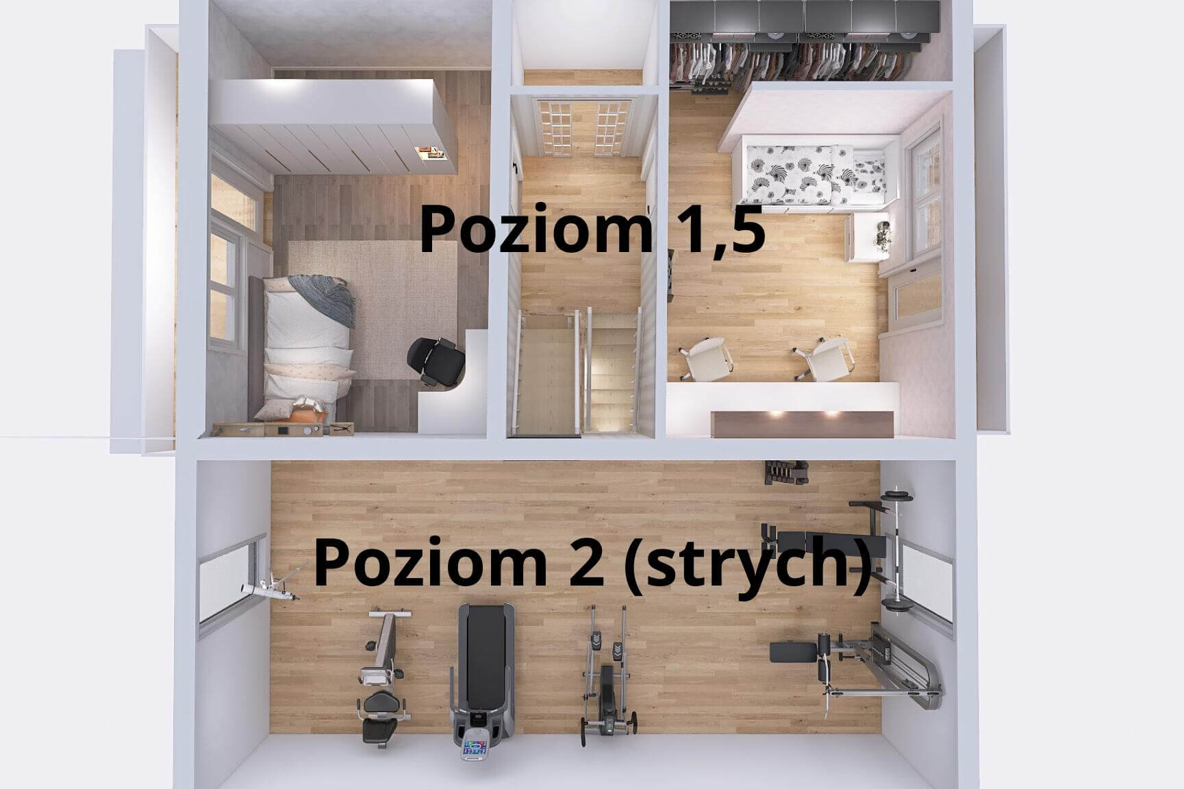 -Kolejne półpiętro: dwie duże sypialnie z garderobami oraz dodatkowa garderoba lub pomieszczenie gospodarcze