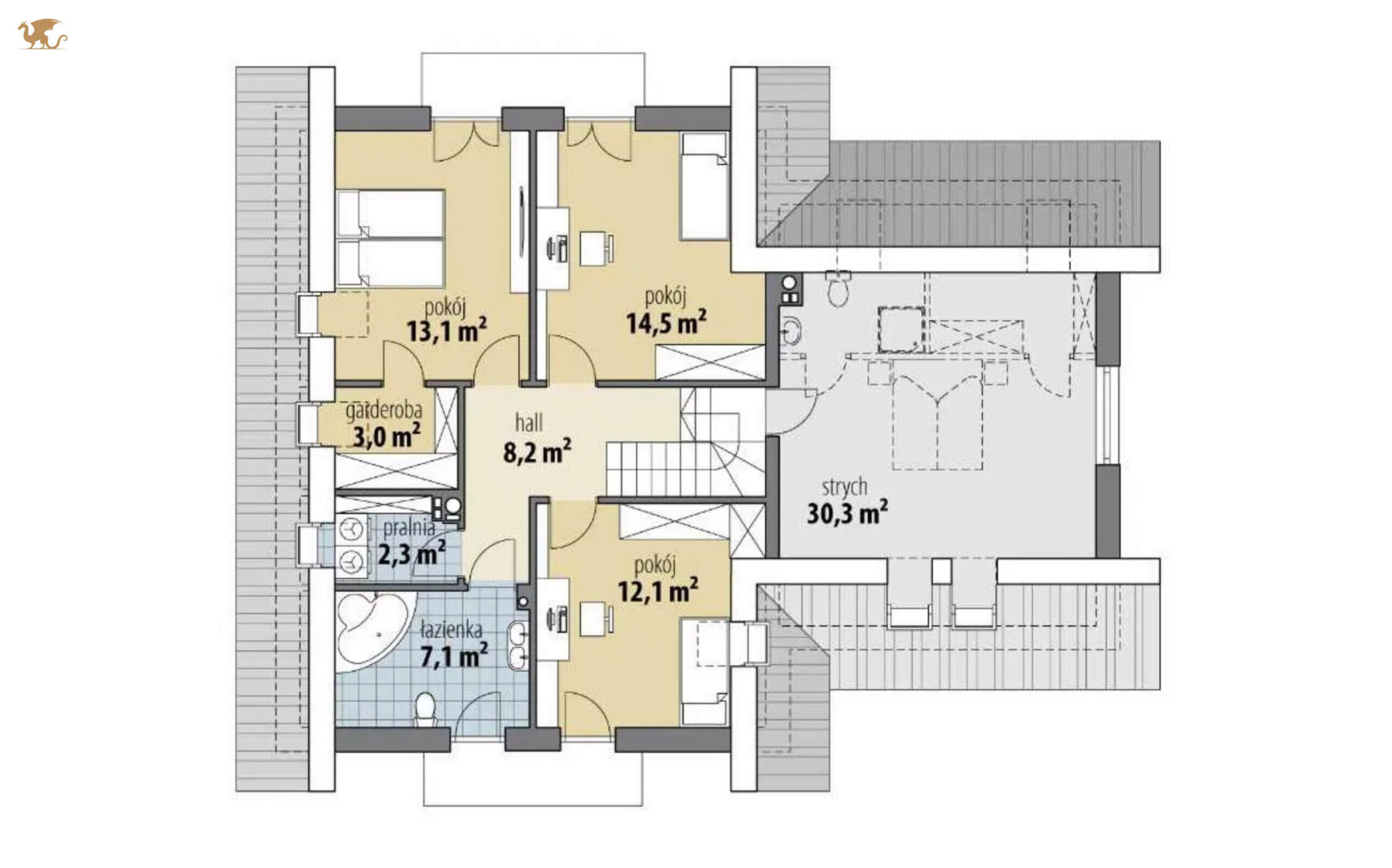 -Półpiętro: strych z możliwością adaptacji na sypialnię z prywatną łazienką i garderobą