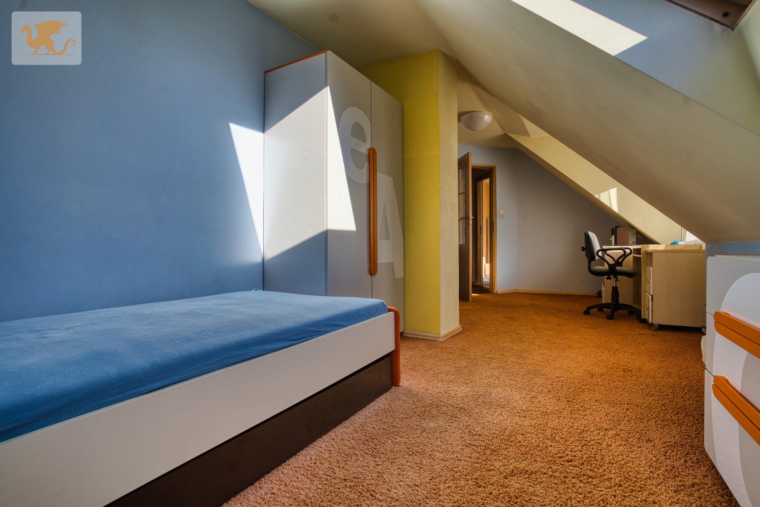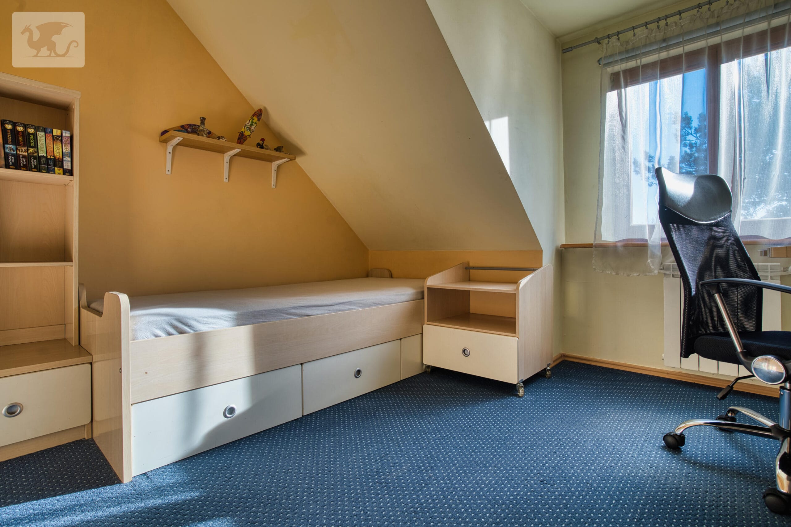 Poddasze tworzy wygodną, prywatną strefę z czterema pokojami, które mogą pełnić funkcję sypialni, gabinetów lub pokoi dziecięcych.