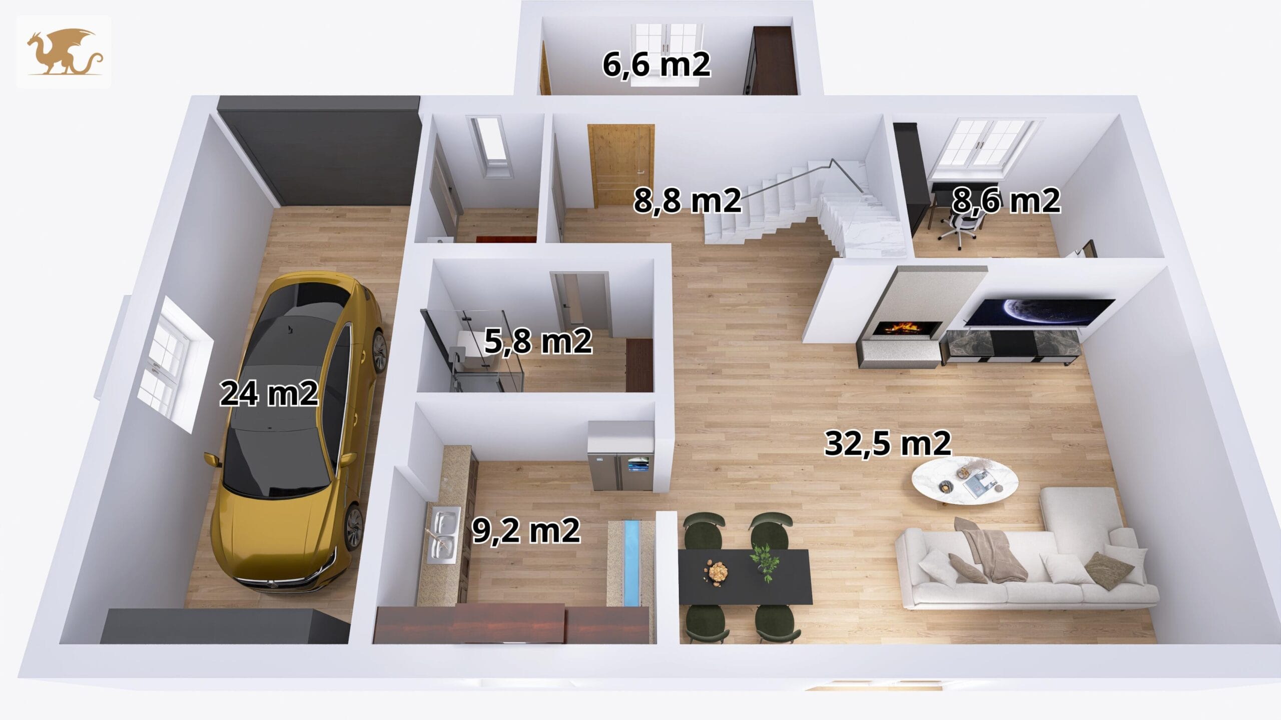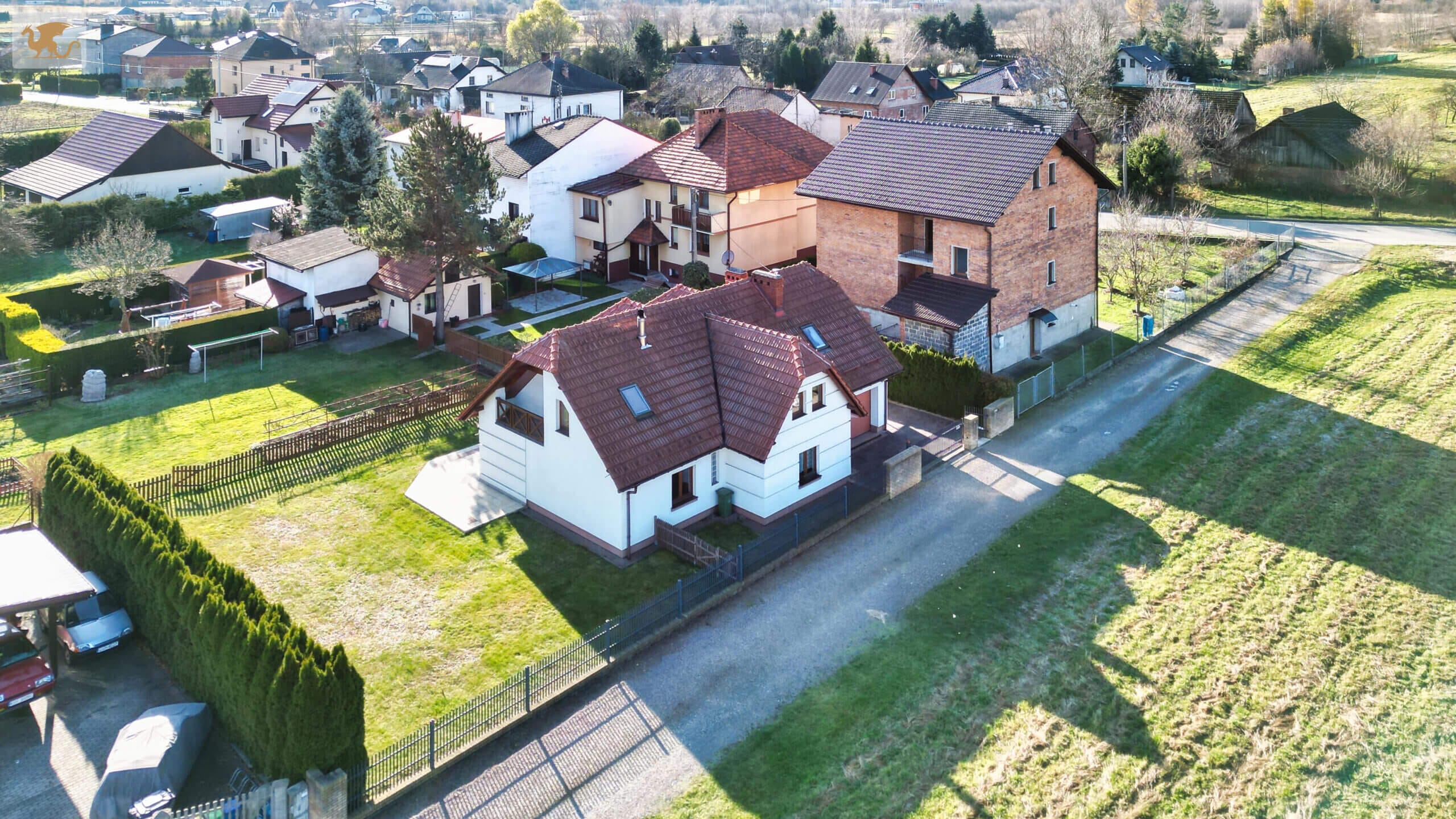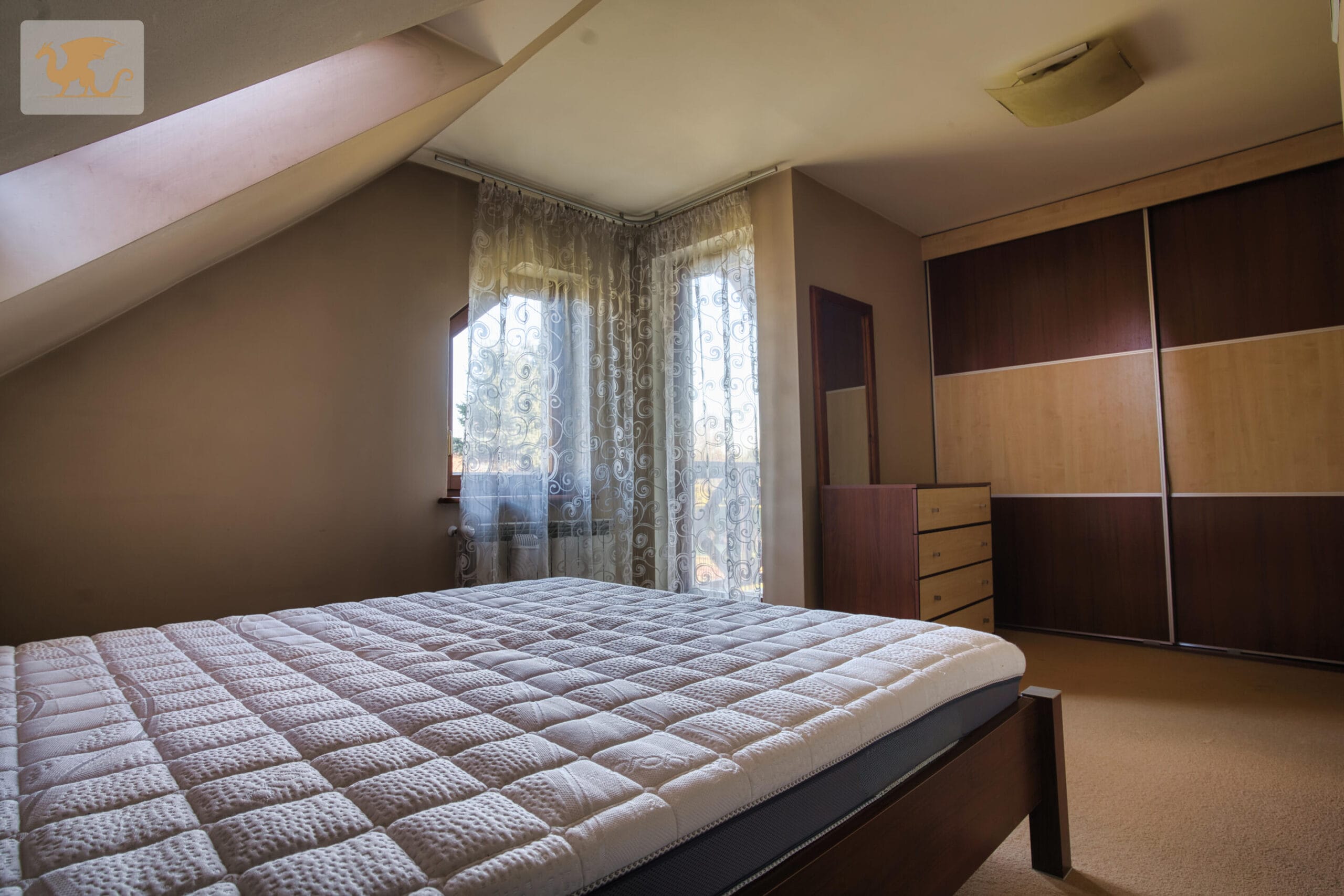 Dom oferuje bardzo funkcjonalny układ z dużą strefą dzienną, 5 pokojami, dwoma łazienkami oraz wygodnymi pomieszczeniami gospodarczymi. Dodatkowym atutem jest strych, stanowiący praktyczne miejsce do przechowywania rzeczy.