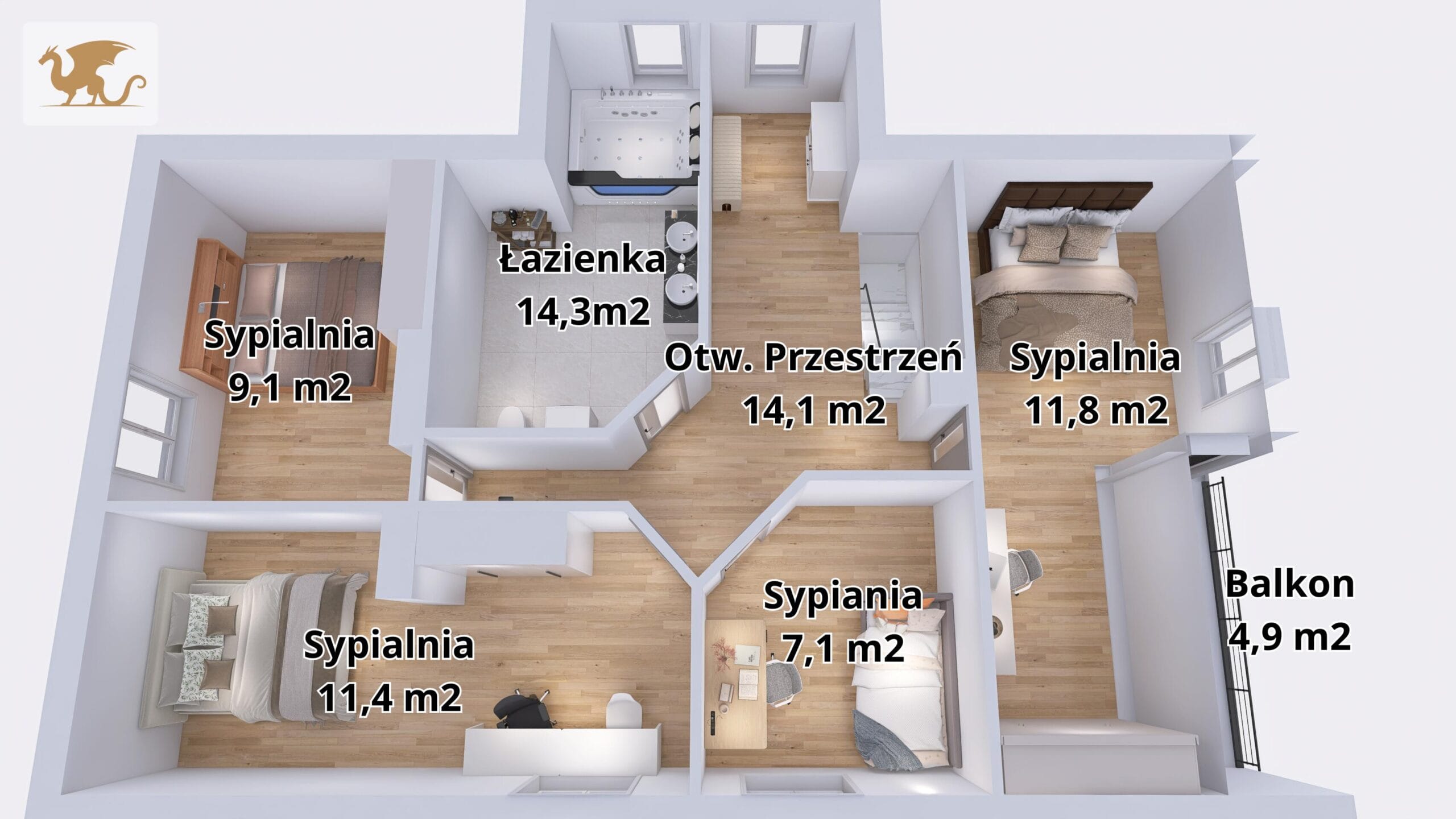 -Bardzo funkcjonalny układ: 5 pokoi, 2 łazienki, duży salon, otwarta kuchnia